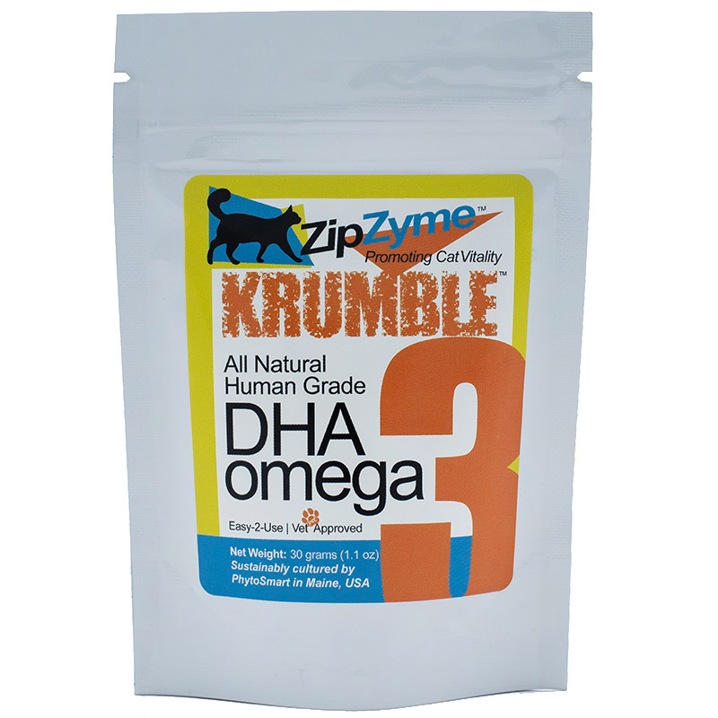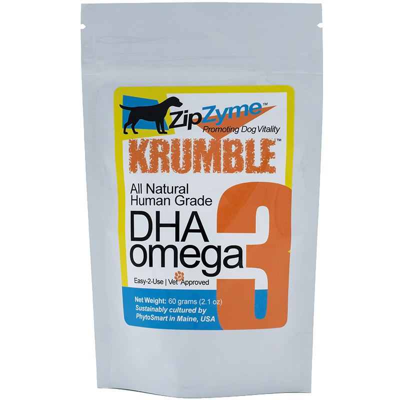 ZipZyme KRUMBLE™ is a dried flake – Our lightweight shelf stable Krumble™ does not require refrigeration and the package is easily stored in the pantry. The dry flake Krumble™ can be easily sprinkled into your pets’ daily meals. Many pets love to lick it out of your hands. It is a convenient, shelf stable, nutrient dense source of bioavailable omega-3 without the mess, inconvenience and potential oxidation hazards of all extracted omega-3 oils on the market.